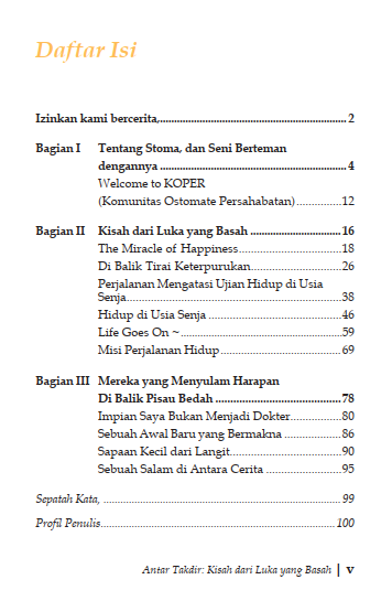 Buku ini bukan hanya cerita dari mereka yang belajar berteman dengan luka, dengan keberanian, dan dengan sesuatu bernama stoma. Antar Takdir: Kisah dari Luka yang Basah menyajikan kisah nyata yang menyentuh hati dari para ostomate, keluarga, dan penyintas kanker yang menemukan kembali arti hidup setelah menghadapi pisau bedah.