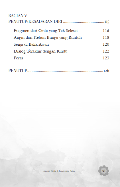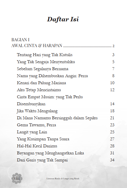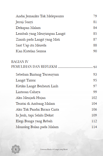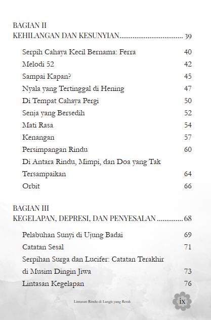 Lintasan Rindu di Langit yang Retak adalah buku tentang keberanian mencintai, tentang menerima bahwa tidak semua yang kita genggam bisa tetap tinggal, dan tentang cara menemukan cahaya di balik retakan. Sebuah perjalanan yang sunyi, namun penuh keindahan — bagi siapa pun yang pernah jatuh cinta, kehilangan, dan memilih untuk tetap hidup dengan hati yang lembut.