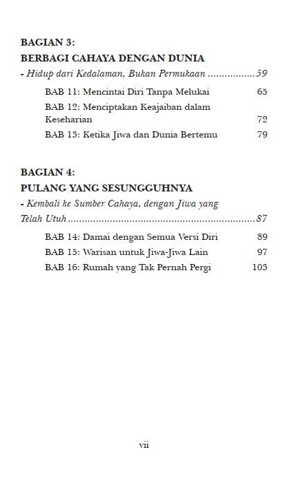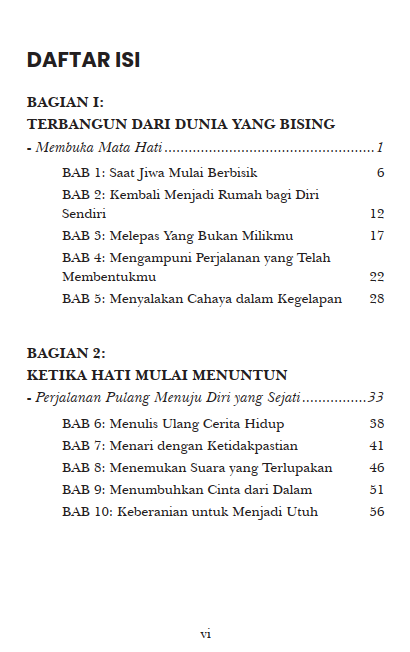 Buku ini bukan sekadar bacaan, melainkan teman yang menemani dan menuntunmu menemukan diri yang utuh. Karena pada akhirnya, perjalanan ini bukan tentang menjadi seseorang di mata dunia, melainkan menjadi diri yang utuh di mata jiwa.