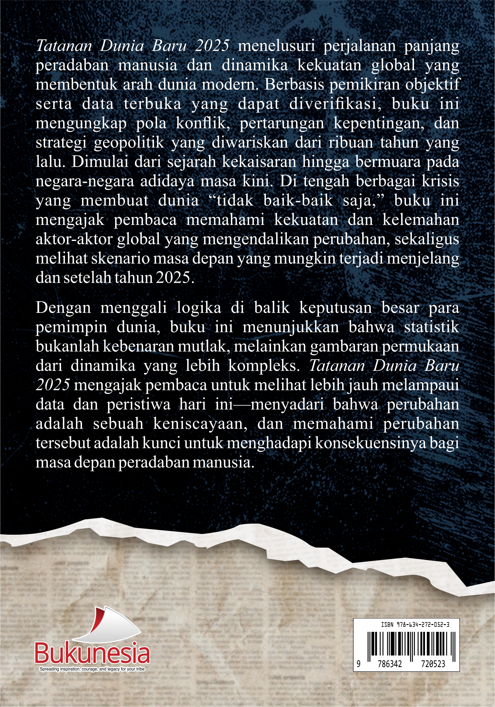 Dengan menggali logika di balik keputusan besar para pemimpin dunia, buku ini menunjukkan bahwa statistik bukanlah kebenaran mutlak, melainkan gambaran permukaan dari dinamika yang lebih kompleks. Tatanan Dunia Baru 2025 mengajak pembaca untuk melihat lebih jauh melampaui data dan peristiwa hari ini—menyadari bahwa perubahan adalah sebuah keniscayaan, dan memahami perubahan tersebut adalah kunci untuk menghadapi konsekuensinya bagi masa depan peradaban manusia.